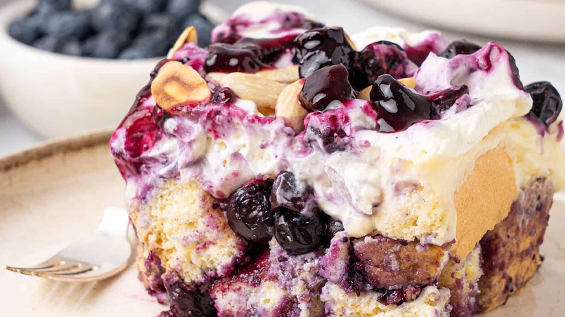Layered with moist cake, a delightful blueberry pie filling, two luscious creams, and toasted almonds, this blueberry heaven-on-earth cake truly lives up to its name! Impressive enough to serve at special events yet simple enough to whip up at home when craving something sweet, this dreamy dessert is bound to be a crowd favorite!