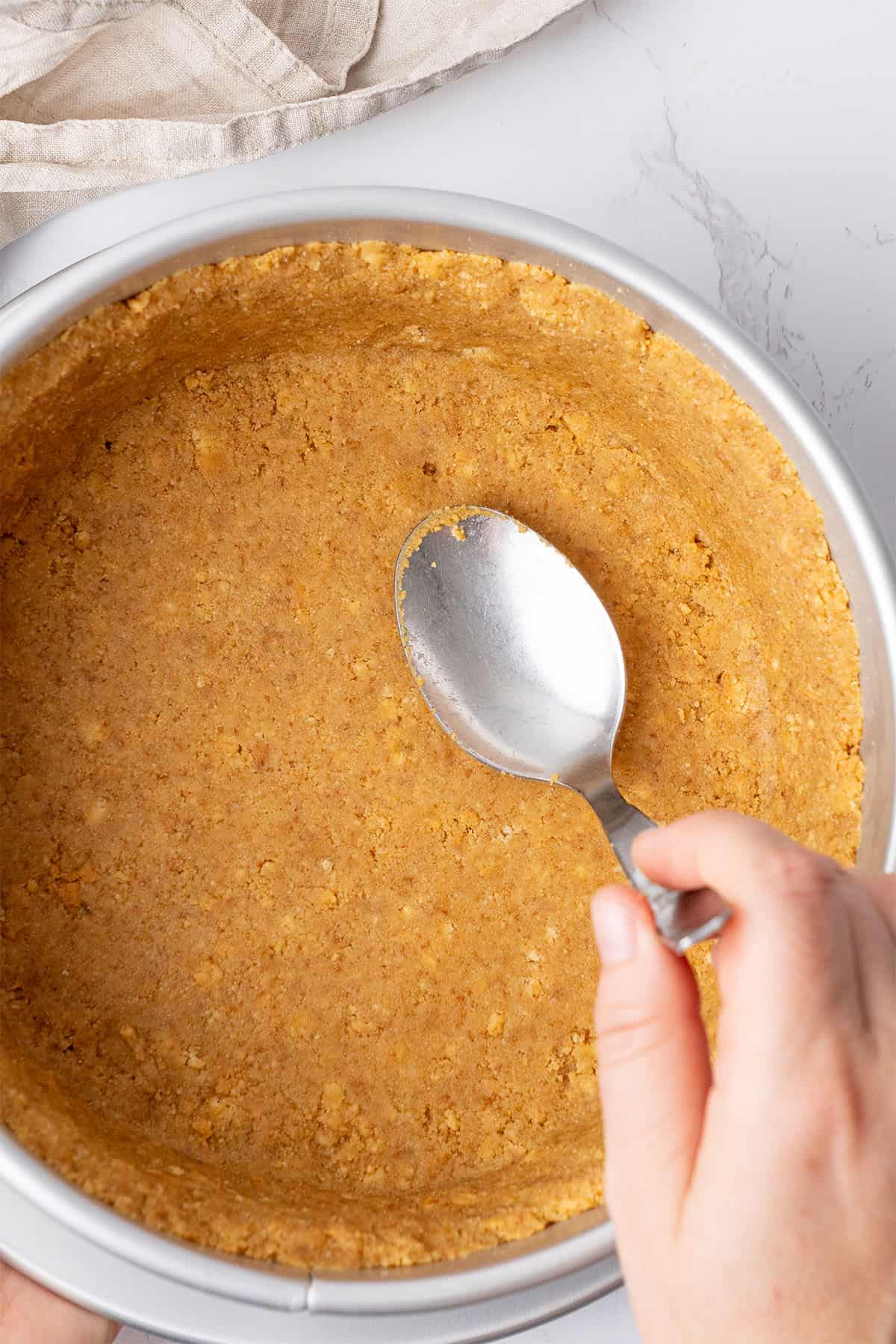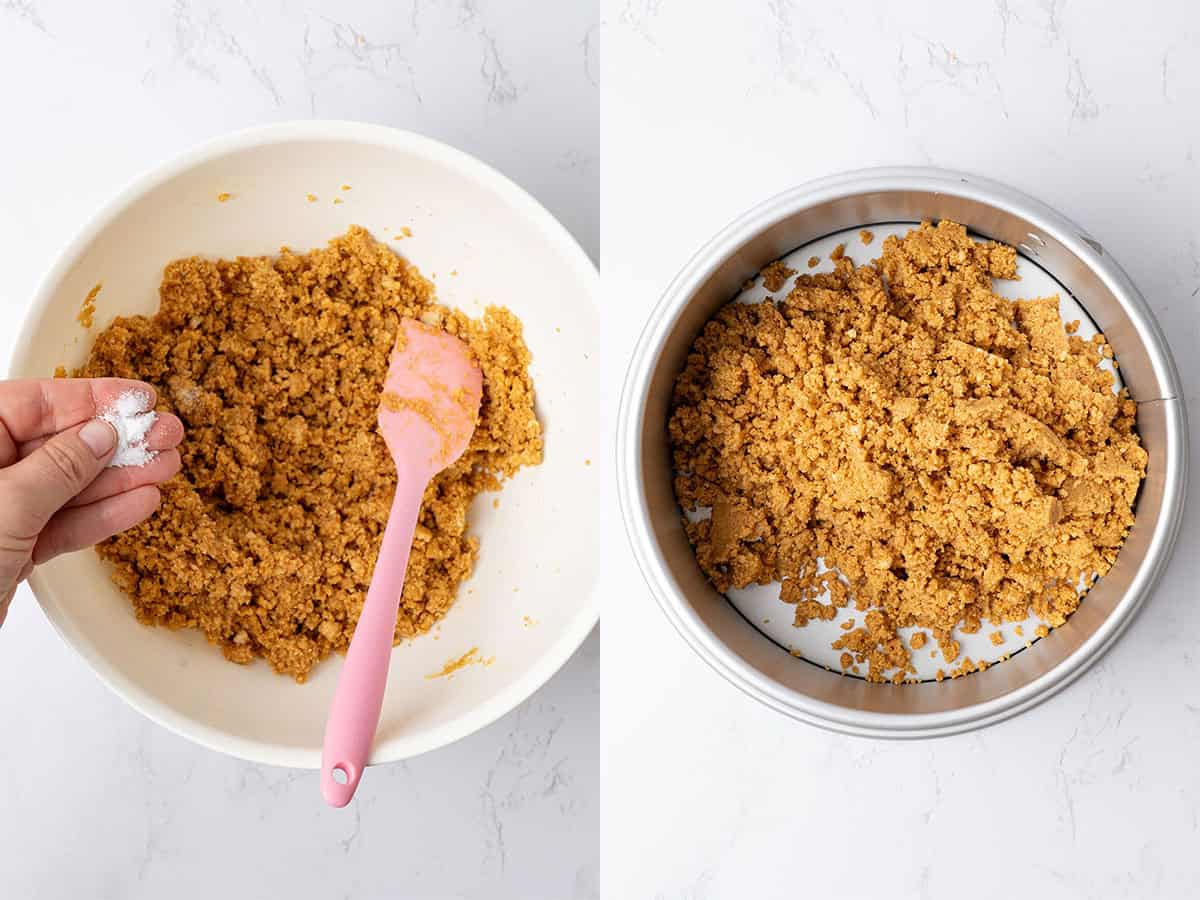 - To avoid a crust that’s too hard, don’t over-pack the crumbs. Firm pressure is enough — pressing too tightly can make it difficult to cut clean slices later.