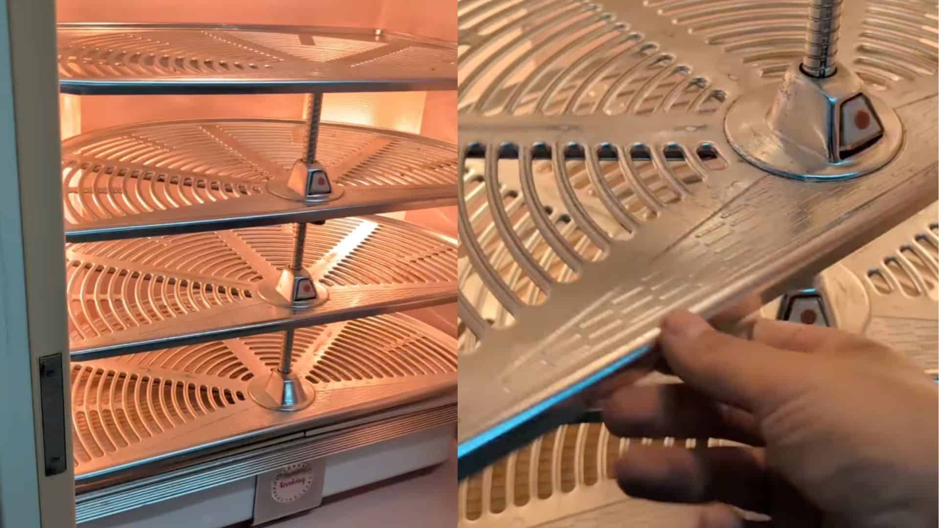 The fridge, he explains, is a General Electric refrigerator from 1958. As he opens the door, one of the first features he highlights is a set of built-in lazy Susans. Instead of digging through crowded shelves, the circular trays spin, making it easy to reach items in the back. They can also be adjusted to different heights depending on what needs to be stored, adding a level of flexibility that many modern fridges still struggle to match.